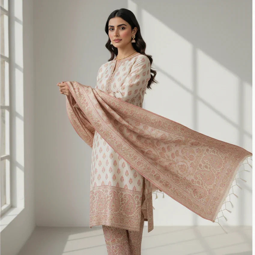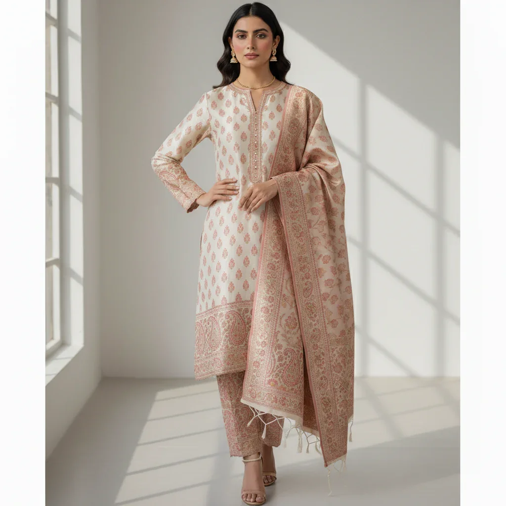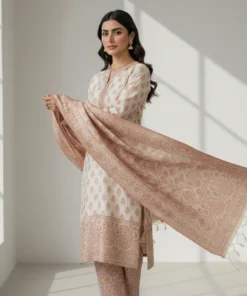 The suit pairs with plain trousers that provide a subtle contrast to the richly patterned shirt and dupatta. This combination keeps the overall look classy without overwhelming the senses. The plain trousers allow focus to remain on the detailed weaving and design of the shirt and dupatta.